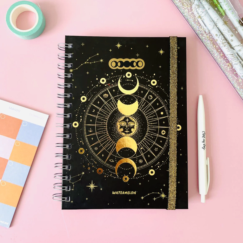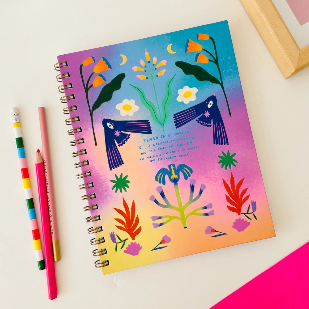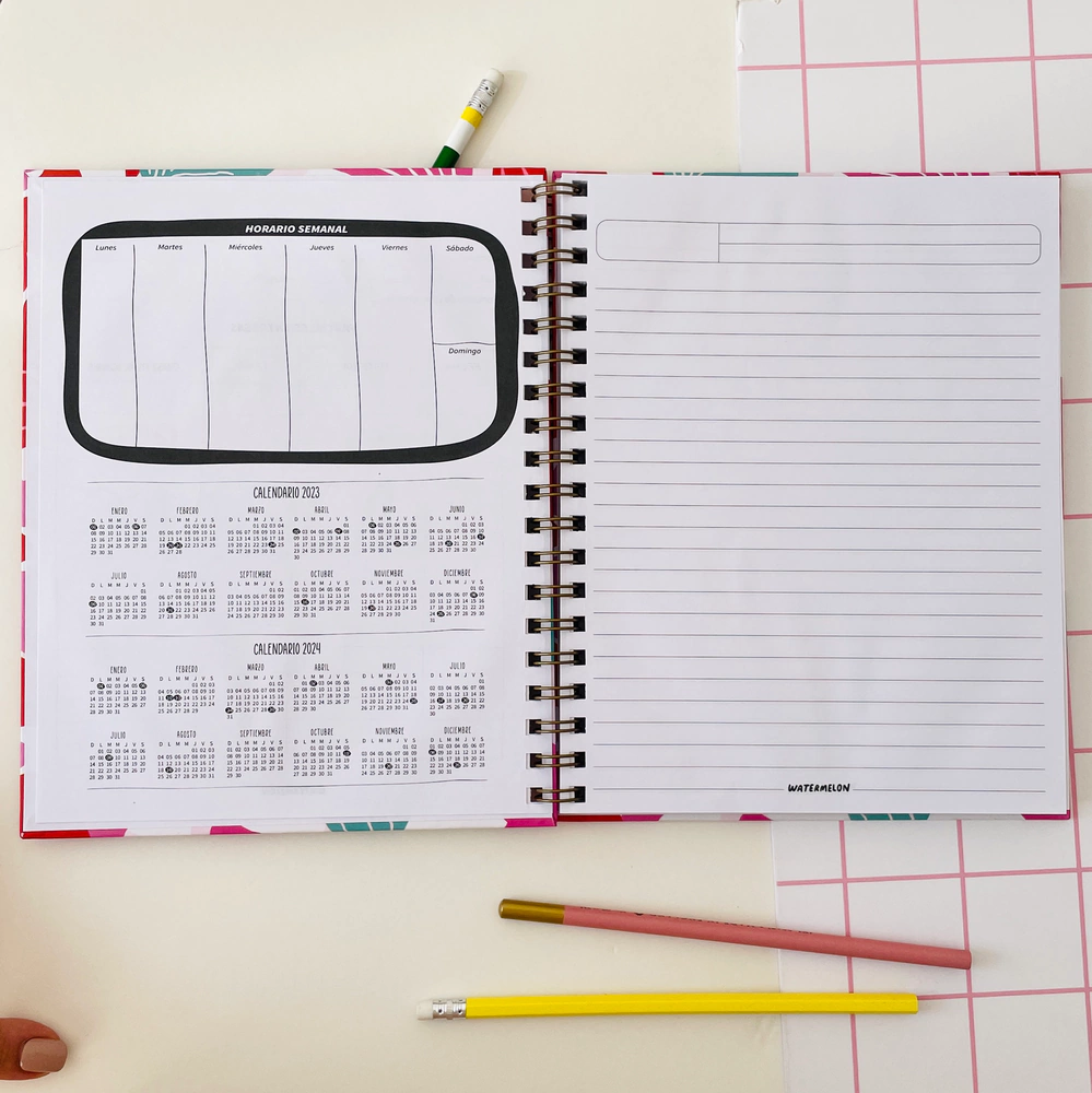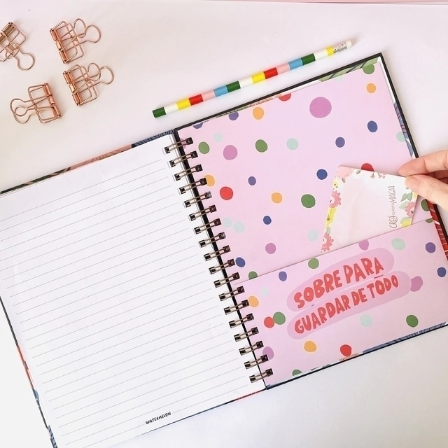 - 100 hojas rayadas - 1 hoja para pintar - 1 calendario 2021 - 1 sobre para guardar papeles - Elástico.