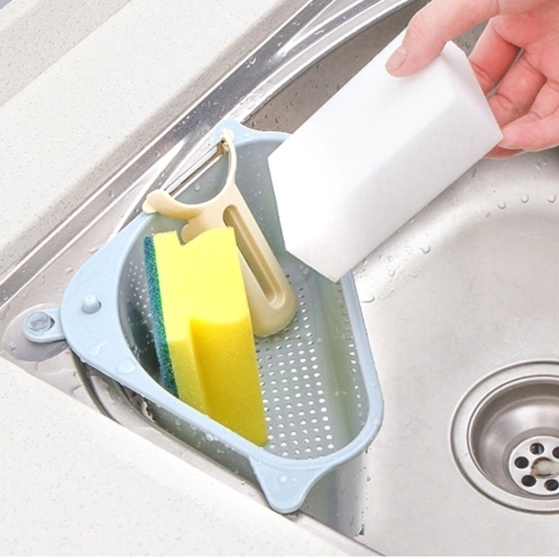Optimiza el espacio en tu cocina con este práctico escurriendo esquinero, diseñado para facilitar el secado de cubiertos, frutas, verduras o para apoyar la esponja de manera segura y ordenada.